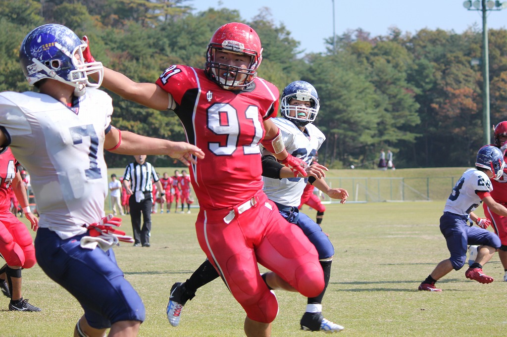 晴れ 前半は秋田#10のキックにより試合開始.岩手はQB#7からWR#87へのパスやQB#4からRB#6へのパスで攻めるが,1stシリーズはパントに終わる.続く秋田はエースQB#7のランやリバースプレーなど果敢にゲインを狙うが,対する岩手もDL#91のロスタックルなど随所で好守を見せ,パントに追いやる. 続く岩手の攻撃はRB#3のオープンランを中心にダウンを更新し,最後はK#2のFGが成功,先制点を挙げる(3-0). 対する秋田もノーハドルや,RB#28のラン,TE#90へのパスなどでダウンを更新するが,パントに追い込まれた際のスナップが乱れ,大幅にロスしてターンオーバーとなり,このチャンスを岩手はTDに繋げる(10-0). その後は両者守備陣が踏ん張り,パントを蹴りあう展開が続くが,拮抗を破ったのは岩手大,RB#3のランやWR#12のスクリーンでRedzoneに侵入し,FGを決め,追加点を取り,キック後の秋田の攻撃を3回でストップすると,岩手はすぐさまWR#12へのパスとランアフターキャッチによりTDを取り,前半は19-0で折り返す. 後半は岩手#2のキックにより試合再開. 早々,秋田はQB#7から#11へのロングパスが決まり,redzoneに侵入するもあと一歩のところを岩手が阻止し,FGトライは失敗,チャンスを逃してしまう. その後の岩手の攻撃を秋田は#60のロスタックルなどで食い止めようとするが,TE#91へのパスやRB#3,#88のランによりTDを取られ,点差は26点と広がる.その後秋田は#7のスクランブル,#28のランなどで攻めるもののダウンは更新できず,再び岩手に押し進められるものの,追加点は与えず. 最後は善戦も虚しく無得点で抑えられ,26-0で岩手大学の勝利となった. 10/18 Report By Echizen. |