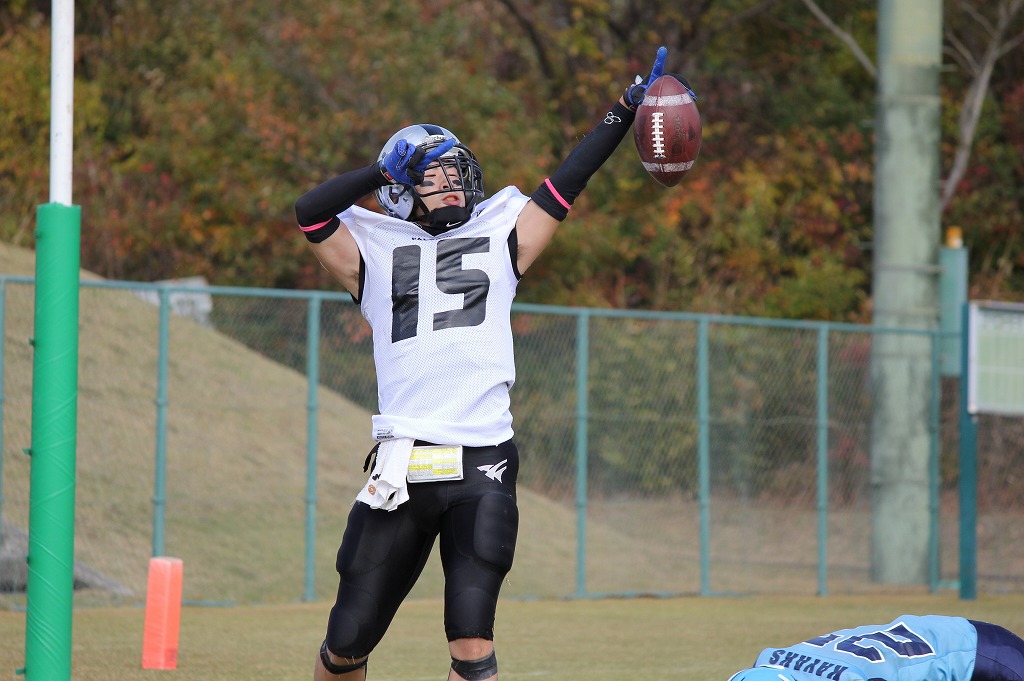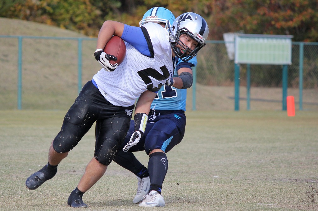 晴れ 1Q仙台大キックオフで試合開始。学院大は自陣10ydまでリターン。学院大は#19、#21のランをベースにゲインを重ねるも、ゴール前でファンブルロストしてしまう。しかし、仙台大のパスプレーを学院大#52がインターセプトし、すぐさま攻撃権を取り戻し#49がTDを決める。キックも決まり7-0と学院大が先制する。仙台大はスナップミスが続き、リズムにのることができない。 2Q学院大は#49のショートパスをベースにゴール前までゲインを重ねる。しかし仙台大#15のインターセプトに阻まれ得点のチャンスを逃す。仙台大はこのプレーを機にリズムを取り戻す。仙台大#22のランを中心にゲインし、最後は#18→#15のパスが決まりTD。キックは決まらず7-6。このスコアのまま前半が終了する。 3Q学院大のキックオフで開始。お互いにディフェンスがアジャストし始め、膠着状態が続く。ディフェンス陣が粘りを見せる中、学院大#49がインターセプト。学院大が流れを引き寄せたように思えたが、パントを蹴りあう状況が続く。3Qは学院大リードで終了。 4Q開始直後に学院大#87のインターセプト。学院大はこのインターセプトを機に前半のようにランプレーメインでG前までゲインを重ねる。学院大はG前で4thDowmギャンブルを選択し、失敗かと思われるが、仙台大痛恨の反則でオートマチック1stDown。学院大はきっちりとTDに結びつけ14-6とする。試合終了間際、仙台大は猛攻を始め、ラン・パスバランスよくゲインを重ねG前まで侵入する。しかし、学院大の好ディフェンスによりターンオーバー。学院大は残り時間を使いきり、試合終了。14-6で学院大の勝利。 11/3 Report By Saitho. |