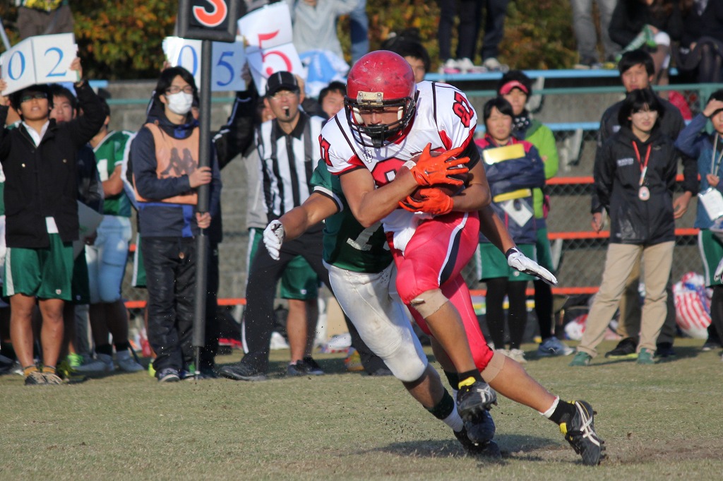 晴れ 1Q 強風の吹き荒れる中、東北大キックで試合開始、岩手大の最初の攻撃は逆風に戻されるパントで終わり、自陣20ydからの苦しいディフェンスとなる。その直後の東北大の攻撃は反則があったものの、#6のTDラン。キックも決まり7-0と東北大が先制する。その後も東北大は#6、#25のランを中心にゲインを重ねる。 2Q 1Q同様、東北大はランプレーを中心にゲインを重ね、FGを決めスコアを10-0とする。その後、岩手大はTE#91へのパスがとおり始めるも東北大のディフェンスに阻まれ続ける。東北大は#6のロングゲインを機に時間を使いながら着実にゲインを重ね、#7のTD。キックも決まりスコアは10-0。岩手大は残り1分を切ってから攻撃を開始し、敵陣30ydまで進むもインターセプト。前半は10-0で東北大リードで終了した。 3Q 岩手大のキックオフで試合再開。東北大はキックオフリターンTDを決める。キックも決まり17-0。ここまで押し込まれていた岩手大のディフェンスもアジャストし始め、#73のQBサックがでるなど両者譲らぬ展開となり、3Qが終了する。 4Q 岩手大は執念の粘りを見せる。#56がインターセプトリターンTDを決め、スコアを24-14とする。岩手大の勢いは止まらない。反則はあったもののオンサイドキックが成功し再び攻撃権を獲得。そのチャンスをきっちりと生かし、岩手大#3へのTDパスがヒットしスコアを24-20、TD1本で逆転というところまで追い上げる。その後の東北大の攻撃はこの試合を象徴するようなパワープレーでゲインを重ねる。岩手大ディフェンスも踏ん張るものの東北大#6のオープンへのランでTD。スコアを31-20とする。その後の岩手大のオフェンスは各ターゲットにボールを散らし、パスを通し続けるもタイムアップとなった。 最終スコアは31-20となり、東北大のパインボウル出場が決まった。 11/3 Report By Saitoho. |