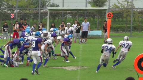 会場:ダイナヒルズ運動公園 天候:晴れ 前半は山形のリターンから攻撃開始。山形はランプレー中心で攻めるものの、北里のフロントもよく耐え、puntに追い込む。 その後北里の攻撃も山形が良いディフェンスを見せ、ここからお互いにpuntの蹴り合いが続く。1Q終盤には山形#8のラン、#6へのロングパスにより敵陣深くに進むが、反則もありpuntとなる。 均衡を破ったのは山形ディフェンスで、2Q終盤に北里自陣深くからのランプレーをロスタックルし、セーフティとなる。 後半は開始早々ファンブルやインターセプトが続き、お互い攻めあぐねたものの、山形#17のランや反則により北里を追い込み、最後は#22のランでTDとなる。 その後、北里は懸命に追い上げようとするが、負傷者により10人となったため、棄権となり試合終了。 9/13 Report By Echizen. |