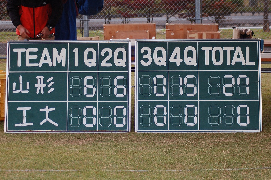晴れ 前半は山形#9のキックにより試合開始。開始早々、東工大は山形にターンオーバーを与えてしまい、山形は絶好の位置からの攻撃をQB#33のランによりTDにつなげる(6-0)。対する東工大はRB#21のランを中心に攻め、QB#18からWR#11へのロングパスも決まり、Redzoneまで侵入するも、FGは失敗、ここからしばらくはお互いパントを蹴りあう展開が続く。均衡を破ったのは山形で、RB#5のランにより追加点をあげ(12−0)、前半終了。 後半は東工大のキックにより試合再開。お互い好守に阻まれ、陣地を進めずにパントを蹴りあう攻防が続き、4Qを迎えるが、ここで山形#33からWR#6へのパスが決まり、TD(18−0)、さらに#5のランによりTDを重ね(24-0)、試合終了間際にFGを決め、27-0のスコアで山形大学が完封勝利した。 10/12 Report By Echizen. |