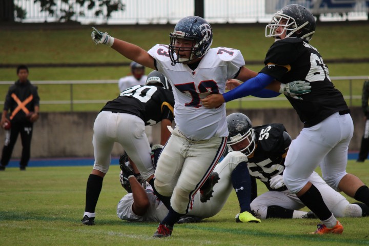東北工大は#4のワイルドキャット等多彩な攻撃を見せるが、日大工#70のQBサックも飛び出しファーストシリーズをパントで終える。