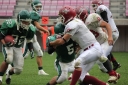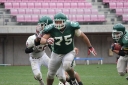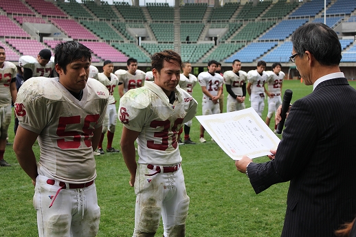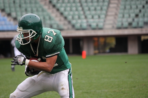 11月11日 天候:くもり パインボウル2012は札幌学院大学のキックオフで始まった。 第1Q、東北大#25小川が札幌学院大のパスをインターセプトすると、前半2分に東北大#32杉本がランプレーでタッチダウンを決め先制する。 東北大学は#26澤田、札幌学院大は#26栗生澤のランプレーを中心に試合を展開していくが、前半13分に東北大#87秋田が#18石川からのパスを受け追加のタッチダウンを決め、14-0とリードを広げる。 東北大はさらに1Q最後、相手のファンブルから攻め込んでいくもフィールドゴールは失敗に終わる。 第2Q、札幌学院大は#26栗生澤のランプレーや#25中村のパスプレーなどでゲインを重ね、#30飯田へのパスプレーでタッチダウン。TFPは失敗に終わり、スコアは14−6となる。 その後東北大は#32杉本のランプレー、#87秋田のパスプレーなどで陣地を進めていき、前半最後にFGを決めスコアを17-6でハーフタイムとなる。 第3Q始め、東北大はオンサイドキックを成功させるが、ダウン更新はできず。その後東北大学は#3長谷川にロングパスが決まり、最後は#21青山がランプレーでタッチダウンを決めスコアを24-6とし、点差を広げる。 対する札幌学院大は#11新田のランプレーや#25中村へのパスプレーで東北大ゴール前1ヤードまで陣地を進める。 しかし、東北大#98中西、#23喜井など東北大ディフェンスの堅守に阻まれ、ギャンブルを試みるもエンドゾーンを割ることができない。 第4Q、東北大学はインターセプトから攻撃を進め、#32杉本が追加のタッチダウンを決める。 札幌学院大は#25中村へのパスプレーや#11新田のランプレーで前進し、#30飯田がパスプレーでタッチダウン。 スコアを31-13と縮めるが、直後のオンサイドキックは東北大学が押え攻撃を続けることができない。 札幌学院大はパスプレーを中心に攻撃をするも思うように得点を重ねることができず、最後に東北大がフィールドゴールを決め、34-13でパインボウルは東北大学の勝利となった。 11/11 Report By Osaka. |