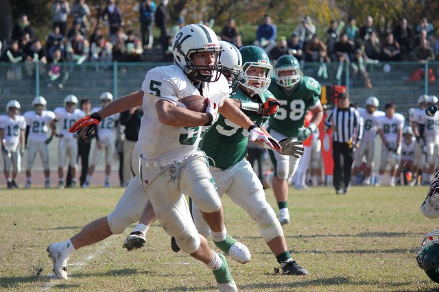 11月17日 天候:晴れ 1Q 北日本代表校決定戦にふさわしい晴天の中、東北大学キック、北海道大学のレシーブにより試合が開始された。 北海道大学の攻撃、#34山口のラン、パスにより1stダウンを獲得する。その後、#5伊藤のラン、#1松尾のランなどにより順調にゲインを重ねる。敵陣10yでの攻撃#5伊藤のランプレーでタッチダウンを獲得、0-6で北海道大学がリードする。東北大学の攻撃はホールディングやパントスナップミスにより思うように攻撃ができない。北海道大学は敵陣15yからの攻撃#5伊藤のランプレーによりタッチダウン。PATも決まり、0-13で北海道大学がリードして1Q終了する。 2Q 東北大学は50y付近からの攻撃。#32杉本、#1松田のランプレー1stダウン」を獲得する。その後もゲインを重ね、敵陣10yからの攻撃#5知識のランなどで進め、最後は#32杉本のランプレーでタッチダウンを獲得、PATも成功し、7-13で東北大学が得点差を詰める。 その後、北海道大学の攻撃は#5伊藤のランやパスを軸に攻撃を進めるが、東北大学#51山辺の好守などに阻まれ、パントとなる。東北大学は#32杉本のランやパスを軸に攻撃を進め、敵陣まで攻め込むも北海道大学ディフェンスは要所をしめ、パントとなる。その後、北海道大学は#34山口や#2岡#18梅原のパスで敵陣3y付近まで進め、最後フィールドゴールを蹴り、成功。7-16で北海道大学がリードし、前半を終了する。 3Q 北海道大学のキックにより試合再開。東北大学は前半同様、ランプレーを中心に攻撃を進めるも、北海道大学ディフェンスに阻まれ攻守交代、その後、北海道大学にパントブロックがあり、東北大学が、敵陣1yから攻撃となる。東北大学は#6若狭のランプレーでタッチダウンを獲得、PATも成功し14-16と東北大学は得点差を縮める。もう1本ほしい北海道大学は#5伊藤のラン、#2岡のパスにより敵陣1yまで攻め込むも東北大学の鉄壁のランディフェンスによりタッチダウンを奪えずに攻守交代で3Qを終了する。 4Q 東北大学の攻撃、敵陣まで攻め込むもあと1本が取れない。パントで攻守交代。自陣10y付近から北海道大学の攻撃、東北大学#85八重樫のインターセプトにより攻守交代し東北大学の攻撃となる。東北大学は#1松田のランプレーによりタッチダウンを獲得、20-16となり東北大学がついに逆転する。 その後、一進一退の攻防が続く。試合終盤、北海道大学は自陣20y付近から攻撃となる。#5伊藤のスクリーンパスや#18の梅原のパス攻撃で攻め込むも、東北大学#51山辺のインターセプトにより試合が決まったかと思われたが、北海道大学#2岡のインターセプトにより攻守交代で北海道大学の攻撃となる。北海道大学は底力をみせ、敵陣深くまで攻め込むも、残り1分弱で4thダウンギャンブル、あと1歩及ばず攻守交代。20-16で東北大学が勝利し試合終了となった。 11/17 Rev02 Report By Nakamura. |